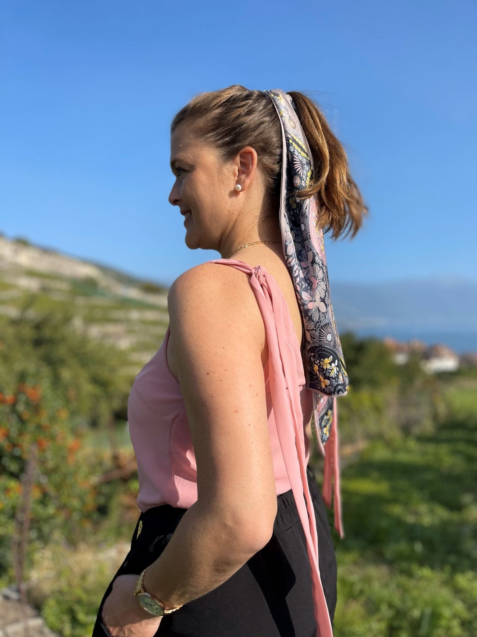 • Peut se porter en foulard, en ceinture ou dans les cheveux